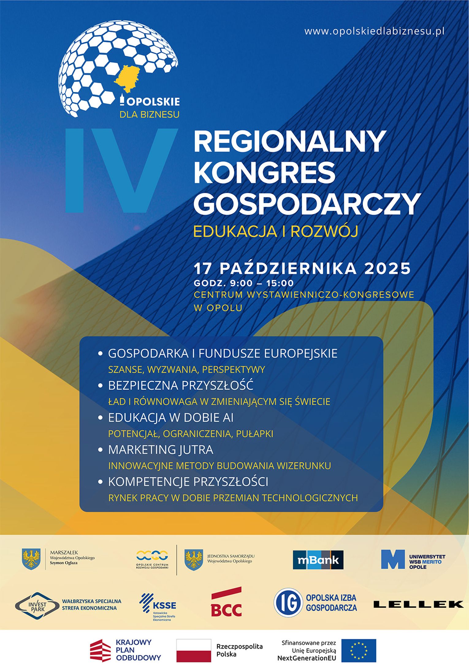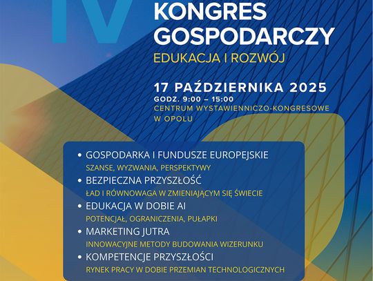 IV Regionalny Kongres Gospodarczy - Edukacja i Rozwój to jedno z kluczowych wydarzeń gospodarczych w regionie, które skupia przedsiębiorców, ekspertów, naukowców i przedstawicieli administracji publicznej. Organizatorami są Opolskie Centrum Rozwoju Gospodarki wraz z Samorządem Województwa Opolskiego. Rejestracja na wydarzenie, które zaplanowano na 17 października 2025 r. w Centrum Wystawienniczo-Kongresowym w Opolu, dostępna jest pod adresem www.opolskiedlabiznesu.pl