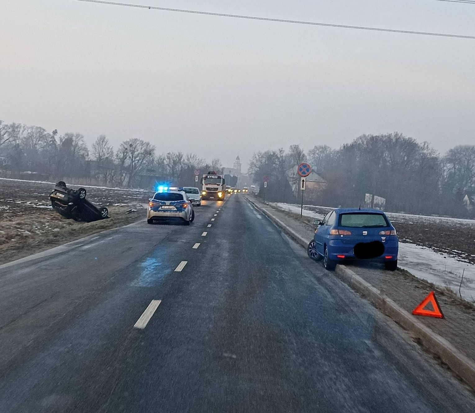 Po przybyciu na miejsce zdarzenia ratownicy zastali cztery uszkodzone pojazdy, które znajdowały się poza jezdnią. Jeden z samochodów leżał na dachu. Na szczęście wszyscy kierujący opuścili pojazdy o własnych siłach przed przyjazdem służb. W wyniku zdarzenia jedna osoba została poszkodowana. Po udzieleniu pierwszej pomocy została zabrana do szpitala.